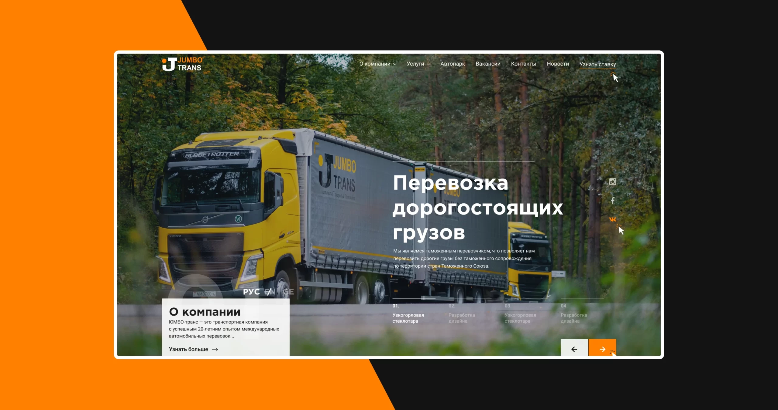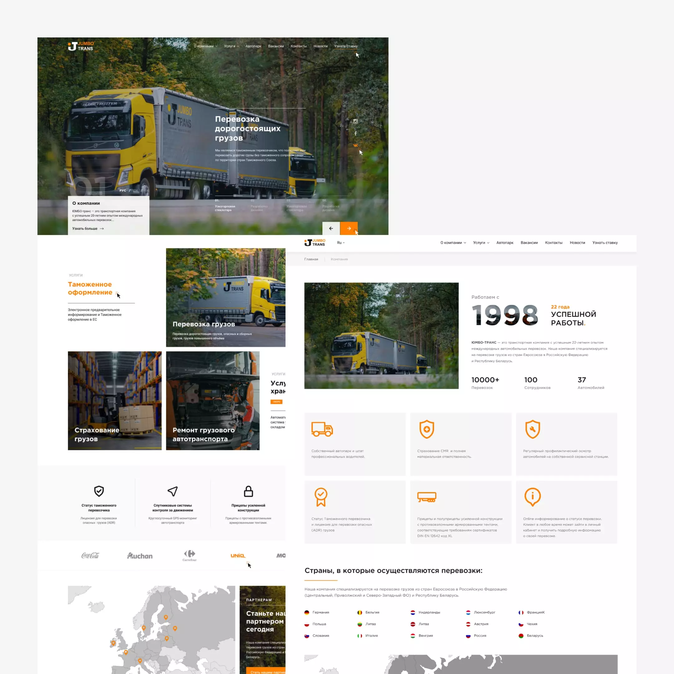 «Юмбо-Транс» – транспортная компания международных автоперевозок. Она существует уже более 20 лет и специализируется на перевозке грузов в странах Европы и СНГ. Перед нами стояла задача разработать корпоративный сайт, который бы рассказывал об услугах организации, демонстрировал разнообразие автопарка и его возможности.