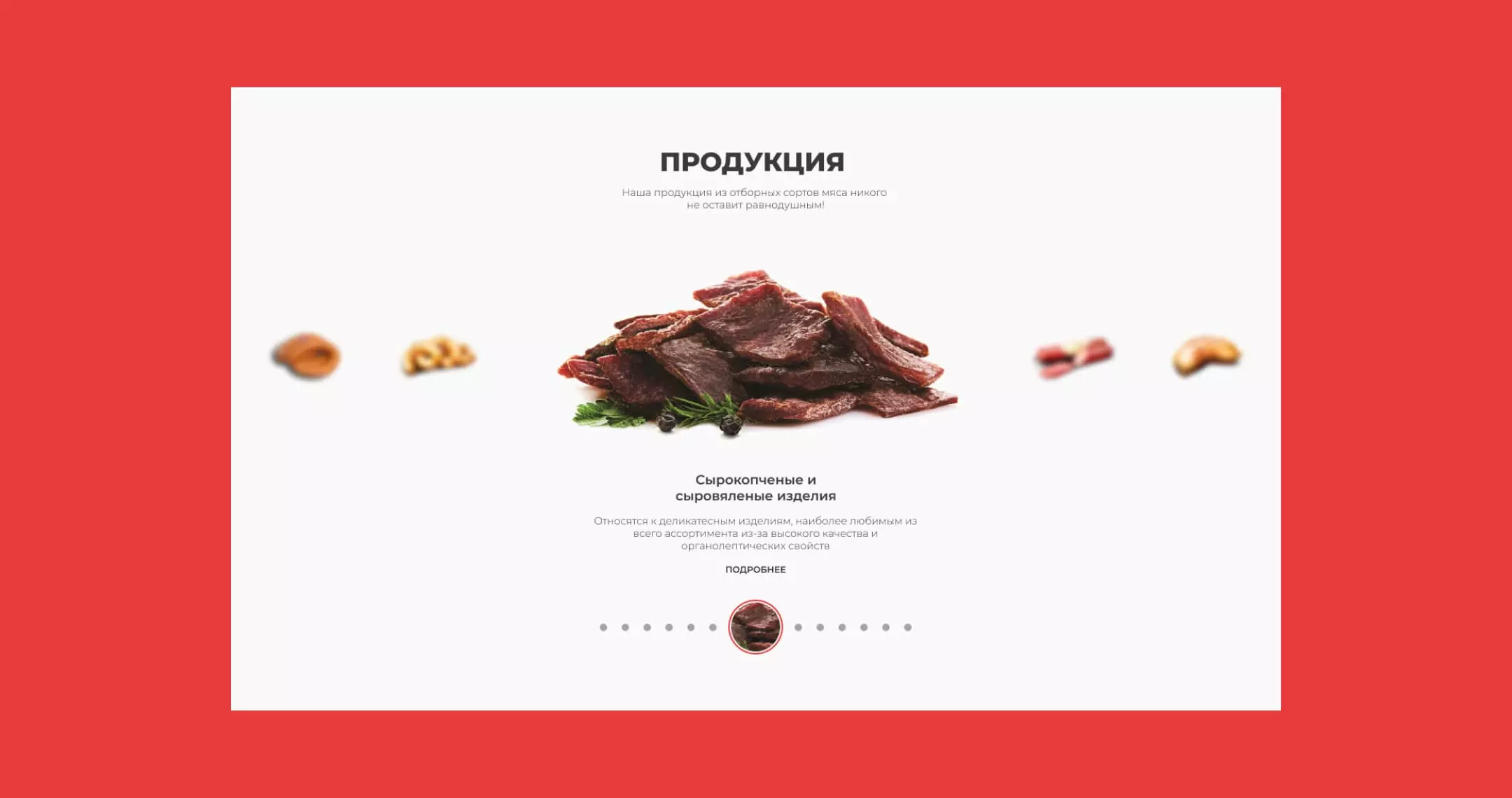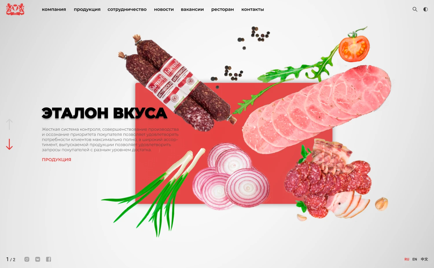 На главной странице акцент был сделан на mouse-параллакс. Этот прием переносит в мир и имитирует взаимодействие с продукцией «Слонимского мясокомбината».